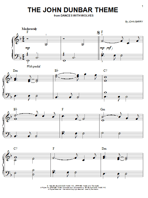 Download or print John Barry The John Dunbar Theme sheet music, chords and digital score arranged for Easy Piano. This Film/TV score includes 3 page(s).