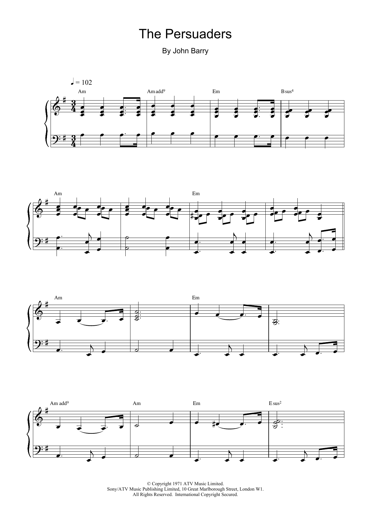 Download or print John Barry The Persuaders sheet music, chords and digital score arranged for Piano Solo. This Film/TV score includes 3 page(s).