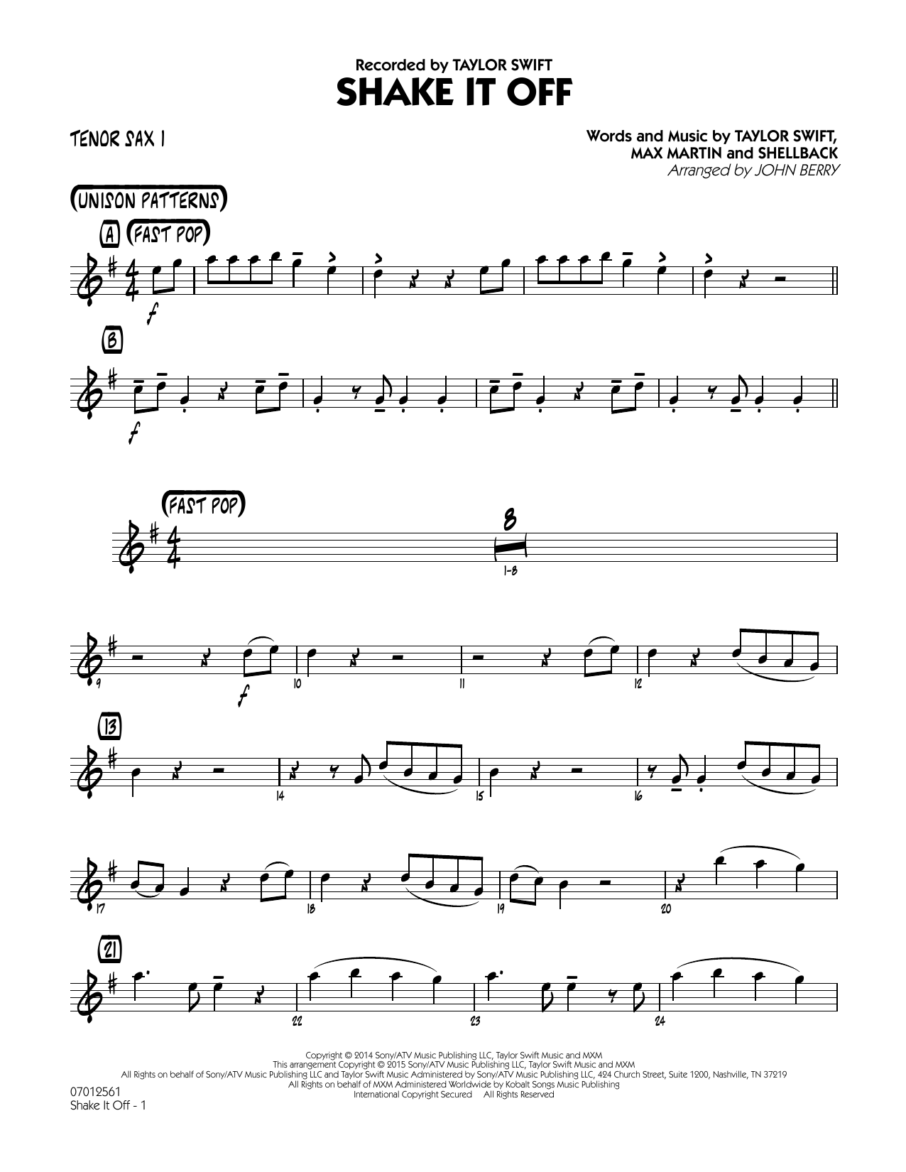 Download or print John Berry Shake It Off - Tenor Sax 1 sheet music, chords and digital score arranged for Jazz Ensemble. This Rock score includes 2 page(s).