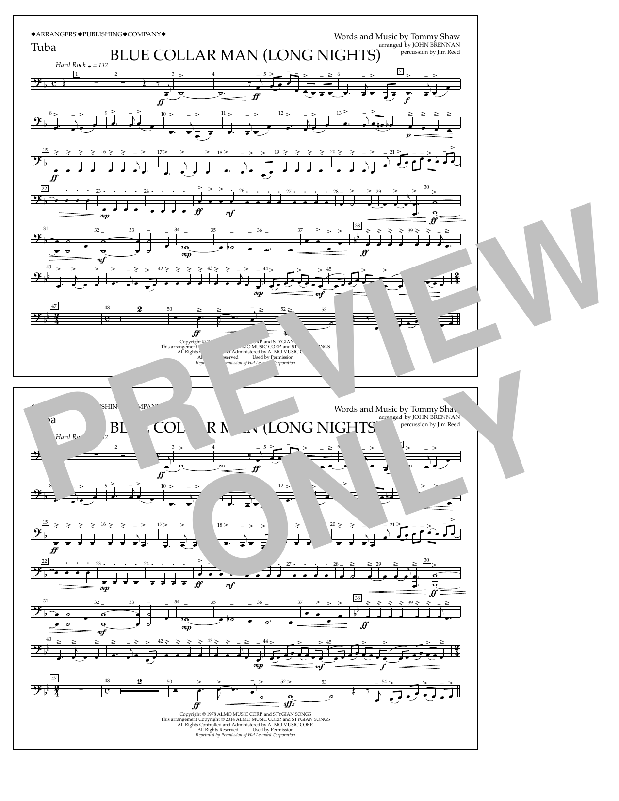 Download or print John Brennan Blue Collar Man (Long Nights) - Tuba sheet music, chords and digital score arranged for Marching Band. This Rock score includes 1 page(s).