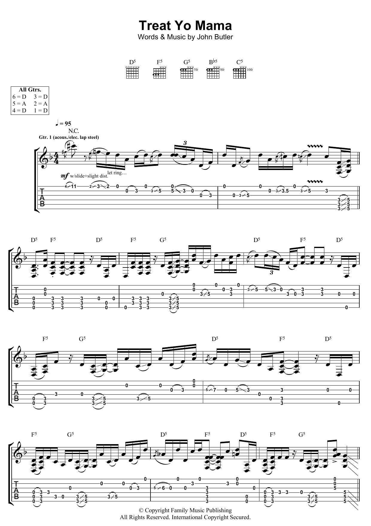 Download or print John Butler Treat Yo Mama sheet music, chords and digital score arranged for Guitar Tab. This Blues score includes 9 page(s).
