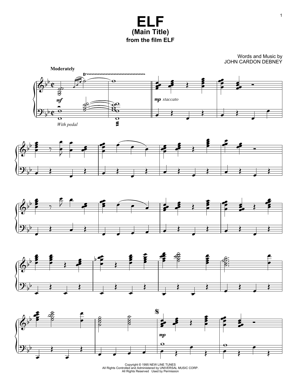 Download or print John Cardon Debney Elf (Main Title) sheet music, chords and digital score arranged for Piano Solo. This Film/TV score includes 3 page(s).