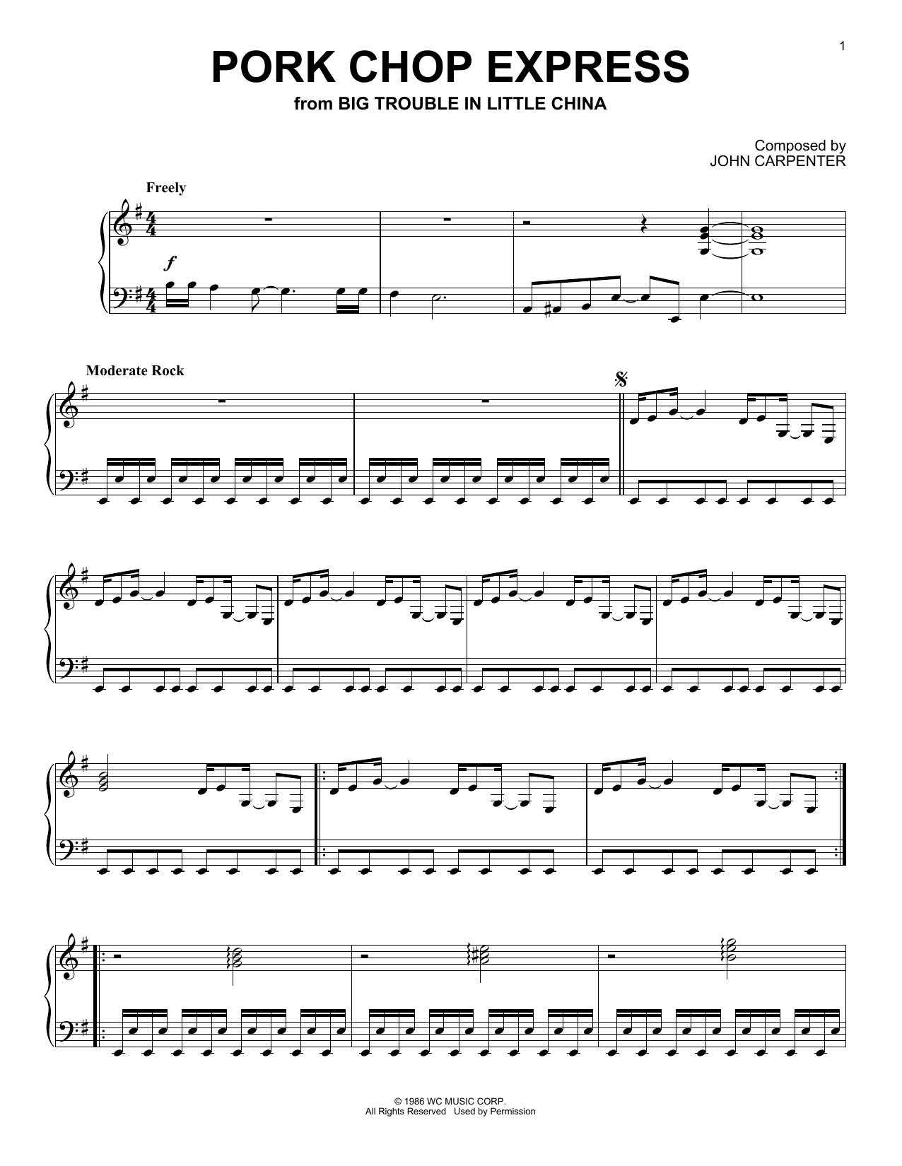 Download or print John Carpenter Pork Chop Express (from Big Trouble In Little China) sheet music, chords and digital score arranged for Piano Solo. This Film/TV score includes 2 page(s).