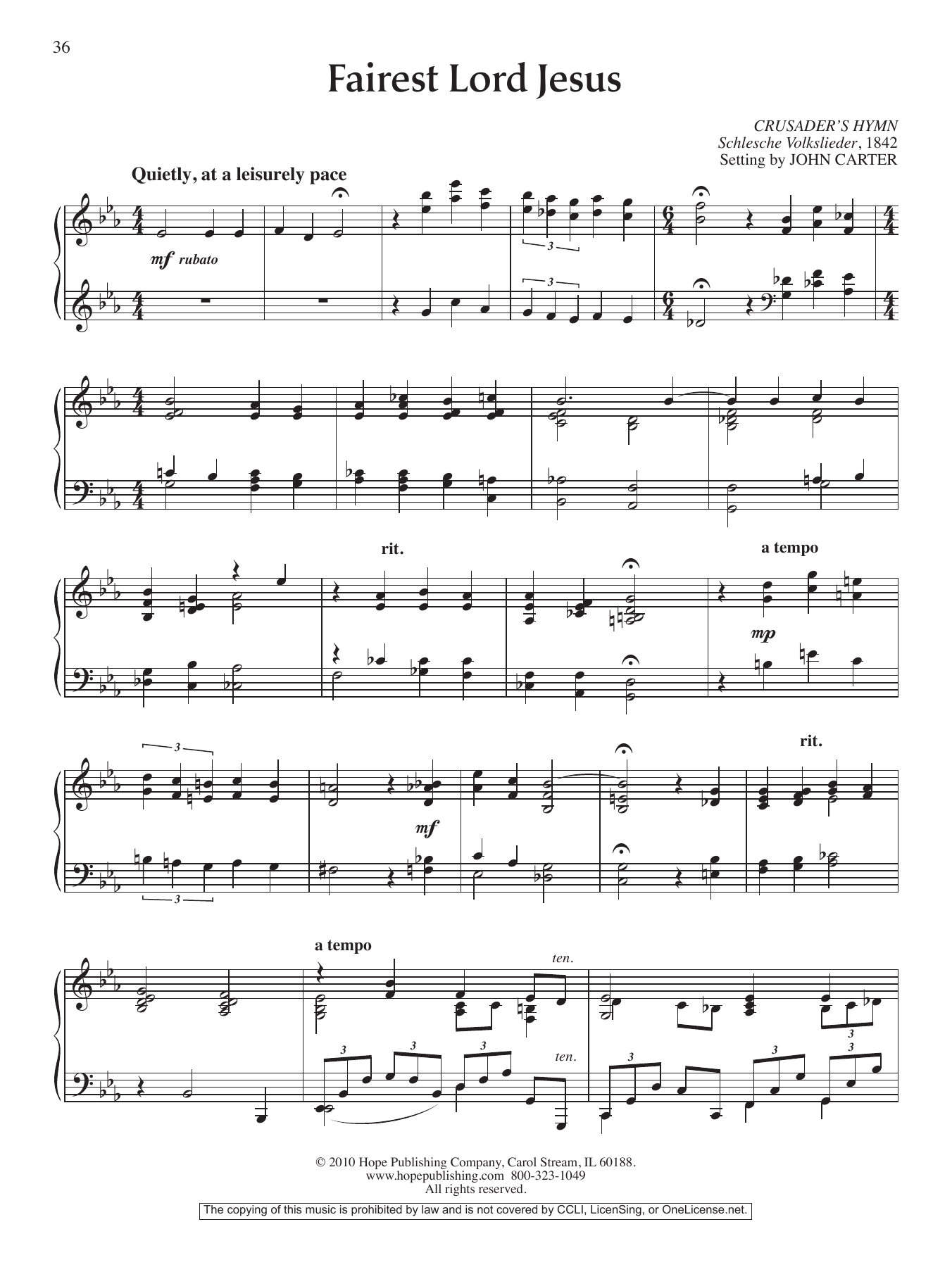 Download or print John Carter Fairest Lord Jesus sheet music, chords and digital score arranged for Piano Solo. This Hymn score includes 2 page(s).