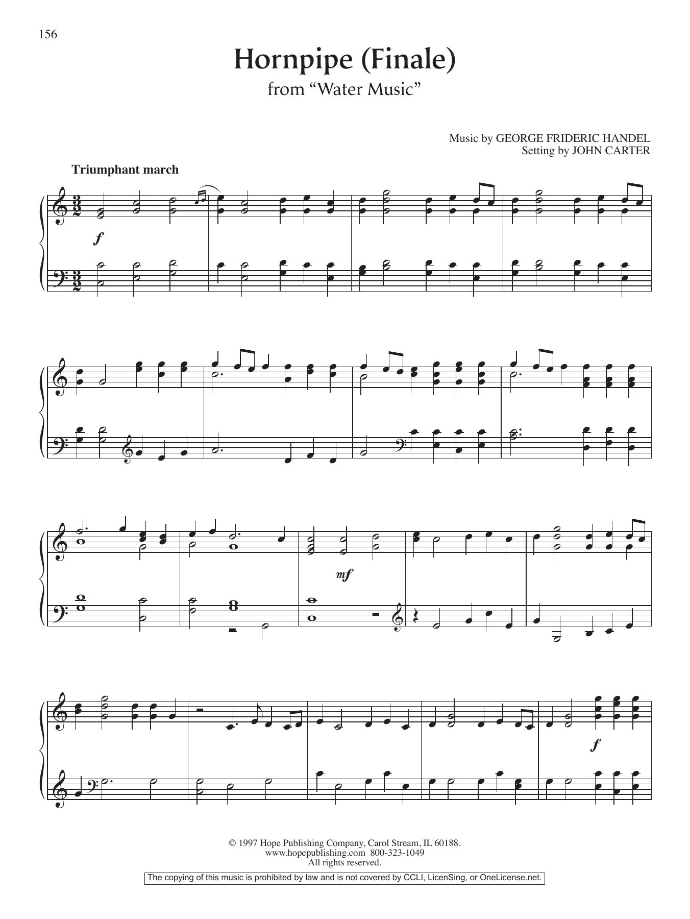 Download or print John Carter Hornpipe (Finale) from "Water Music" sheet music, chords and digital score arranged for Piano Solo. This Hymn score includes 2 page(s).