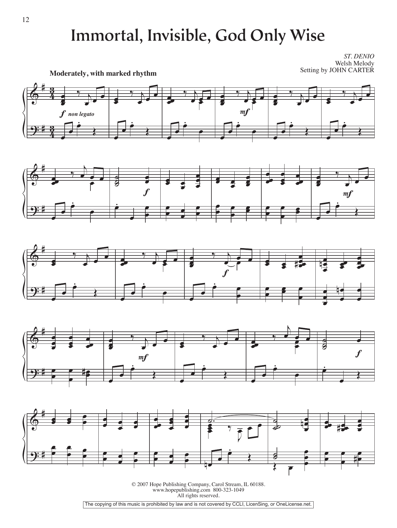 Download or print John Carter Immortal, Invisible, God Only Wise sheet music, chords and digital score arranged for Piano Solo. This Hymn score includes 2 page(s).