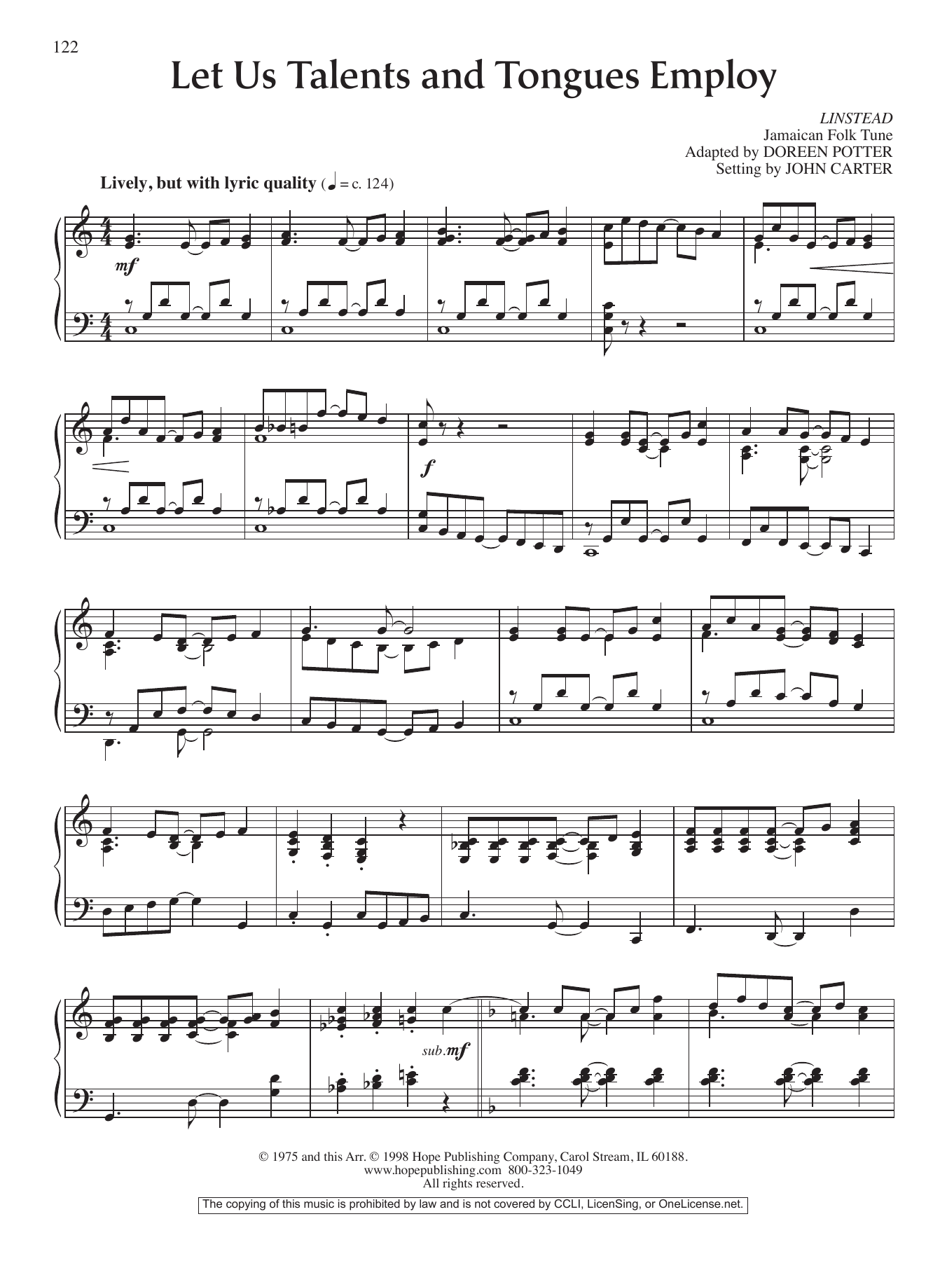 Download or print John Carter Let Us Talents and Tongues Employ sheet music, chords and digital score arranged for Piano Solo. This Hymn score includes 2 page(s).