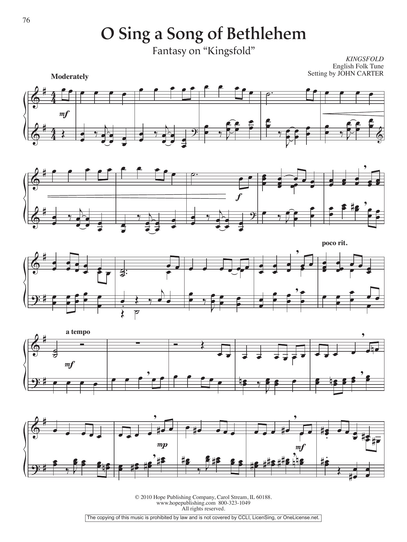 Download or print John Carter O Sing a Song of Bethlehem (Fantasy on "Kingsfold") sheet music, chords and digital score arranged for Piano Solo. This Hymn score includes 2 page(s).