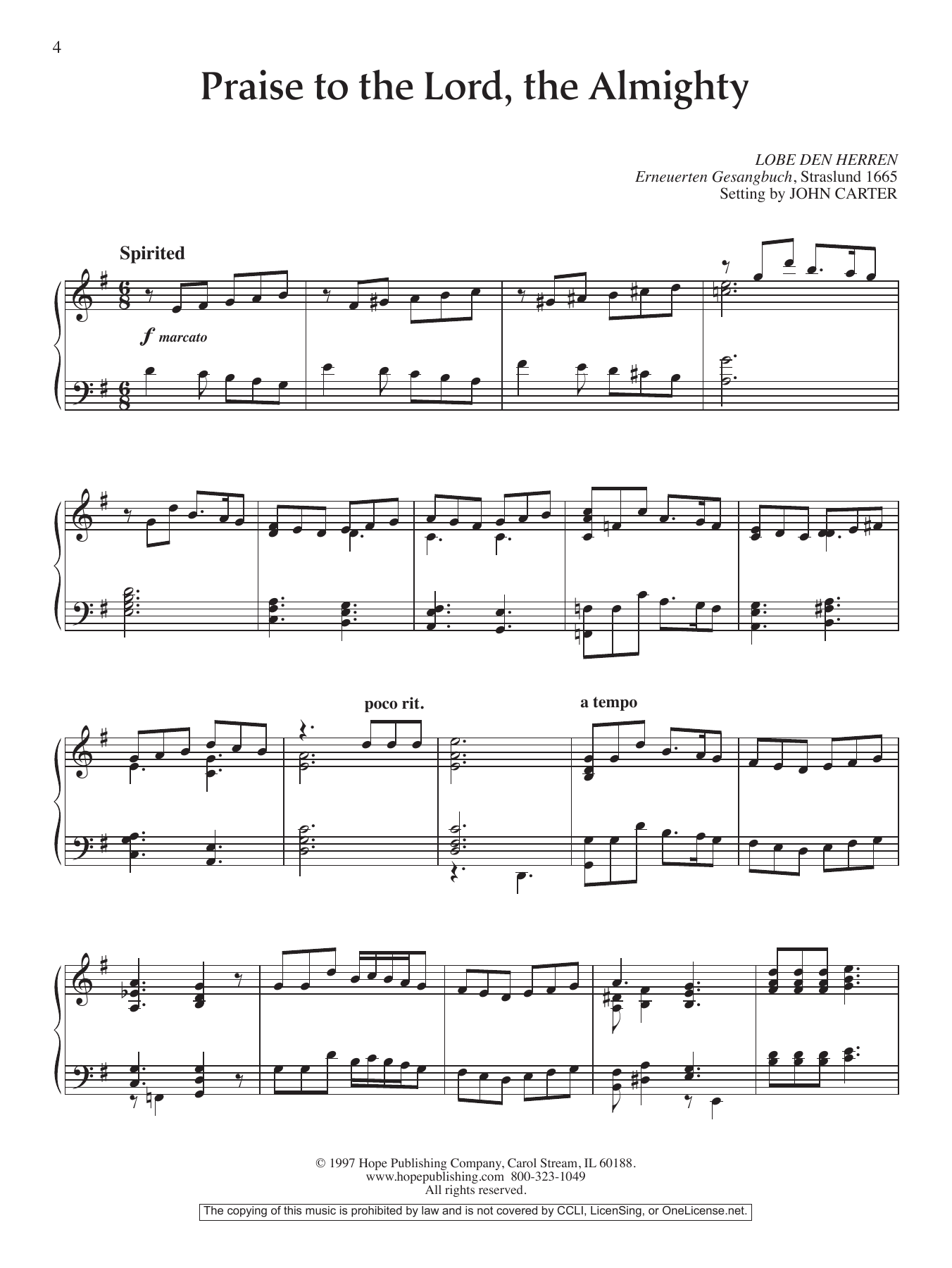 Download or print John Carter Praise to the Lord, the Almighty! sheet music, chords and digital score arranged for Piano Solo. This Hymn score includes 3 page(s).