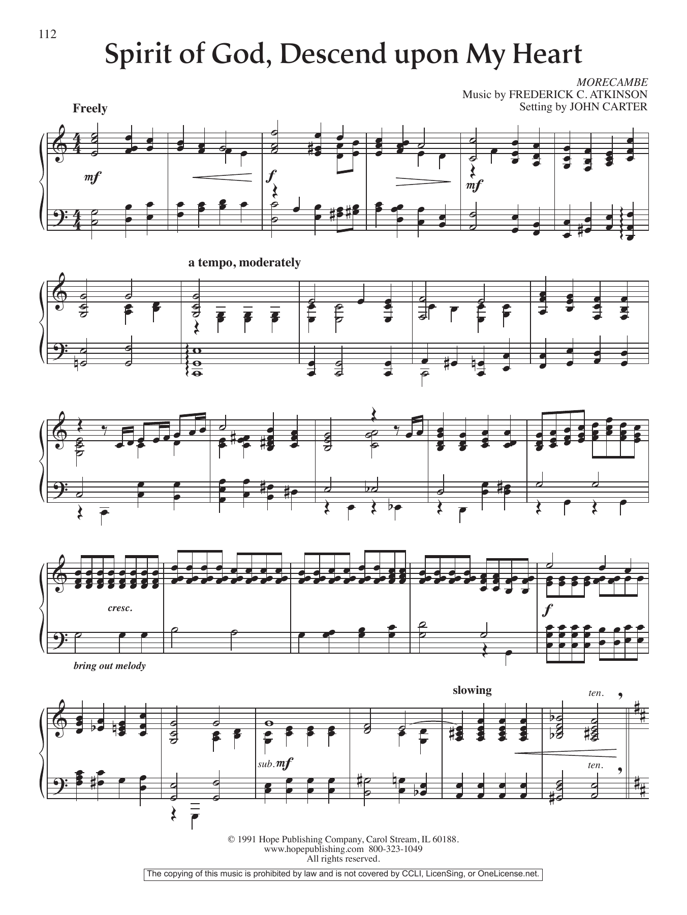 Download or print John Carter Spirit Of God, Descend Upon My Heart sheet music, chords and digital score arranged for Piano Solo. This Hymn score includes 2 page(s).