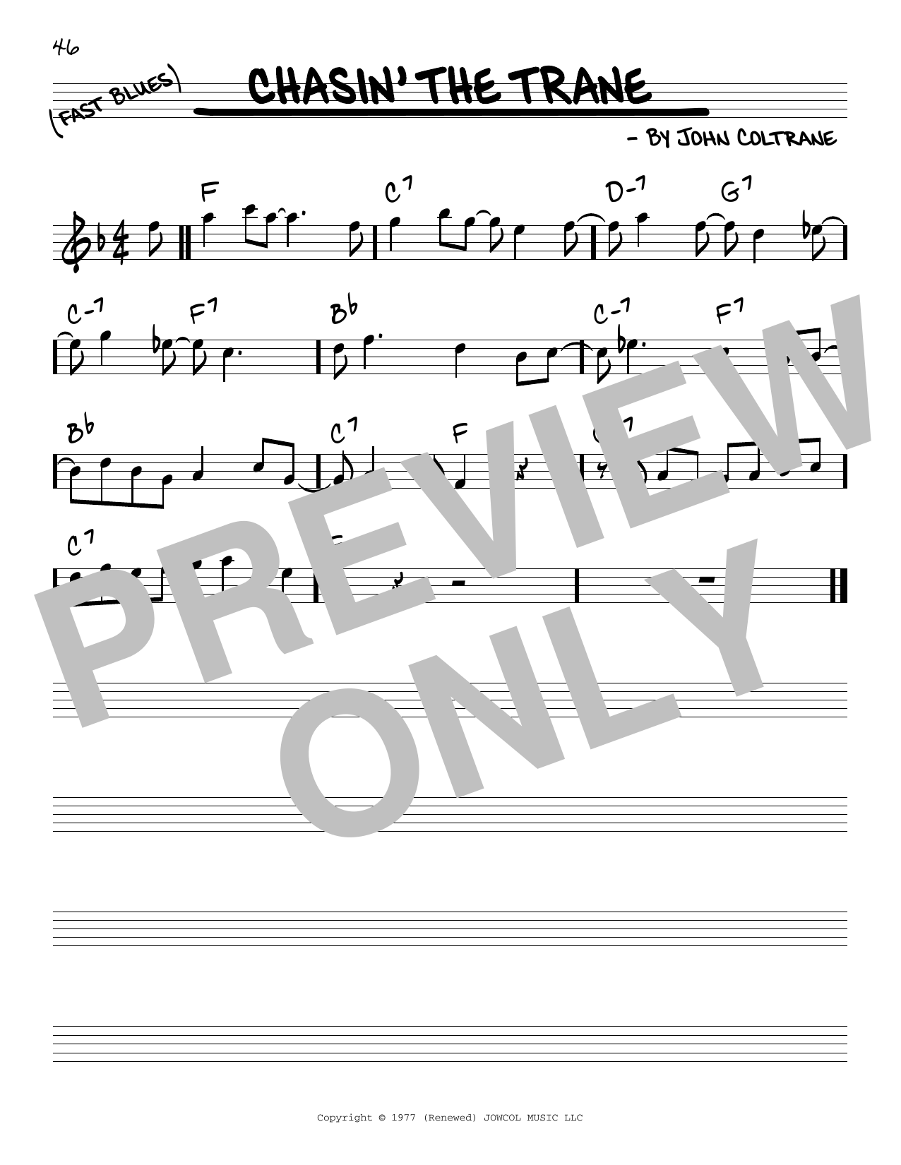Download or print John Coltrane Chasin' The Trane sheet music, chords and digital score arranged for Real Book – Melody & Chords – C Instruments. This Jazz score includes 1 page(s).