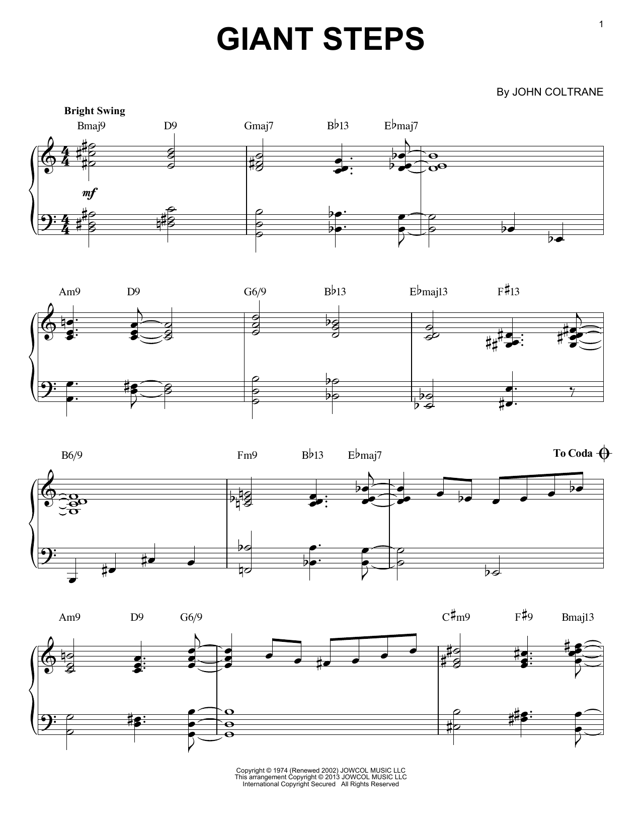 Download or print John Coltrane Giant Steps [Jazz version] (arr. Brent Edstrom) sheet music, chords and digital score arranged for Piano Solo. This Jazz score includes 4 page(s).