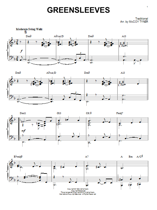 Download or print John Coltrane Greensleeves [Jazz version] (arr. Brent Edstrom) sheet music, chords and digital score arranged for Piano Solo. This Jazz score includes 5 page(s).