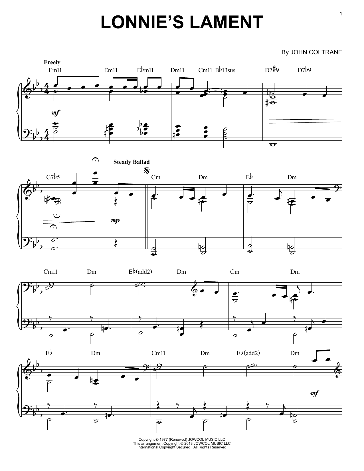 Download or print John Coltrane Lonnie's Lament (arr. Brent Edstrom) sheet music, chords and digital score arranged for Piano Solo. This Jazz score includes 5 page(s).