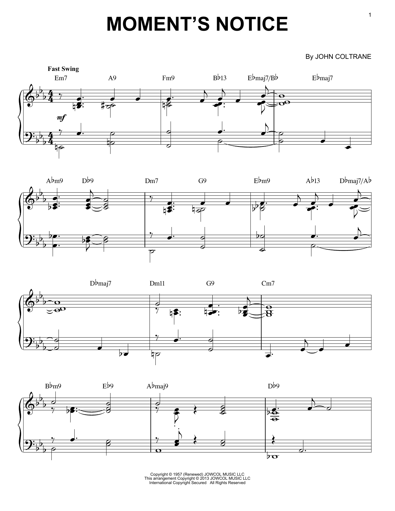 Download or print John Coltrane Moment's Notice (arr. Brent Edstrom) sheet music, chords and digital score arranged for Piano Solo. This Jazz score includes 6 page(s).