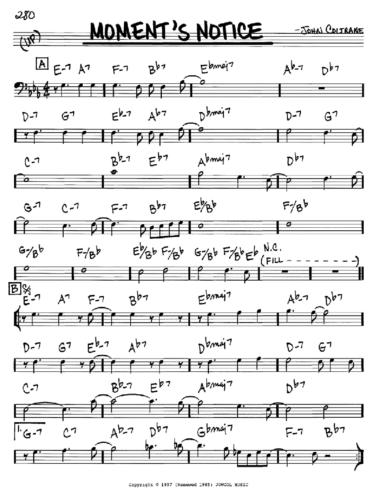 Download or print John Coltrane Moment's Notice sheet music, chords and digital score arranged for Real Book – Melody & Chords – Bb Instruments. This Jazz score includes 2 page(s).