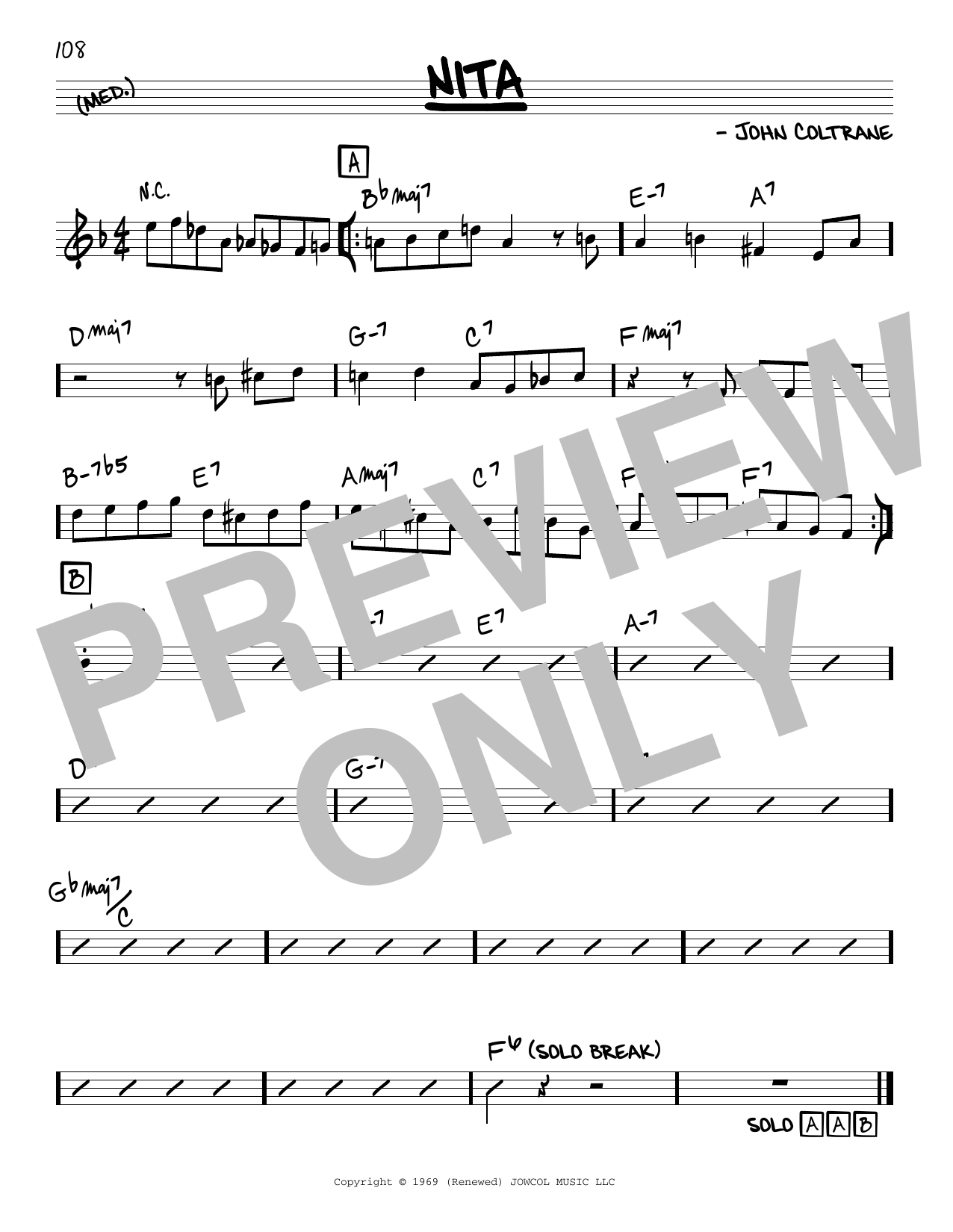 Download or print John Coltrane Nita sheet music, chords and digital score arranged for Real Book – Melody & Chords. This Jazz score includes 1 page(s).