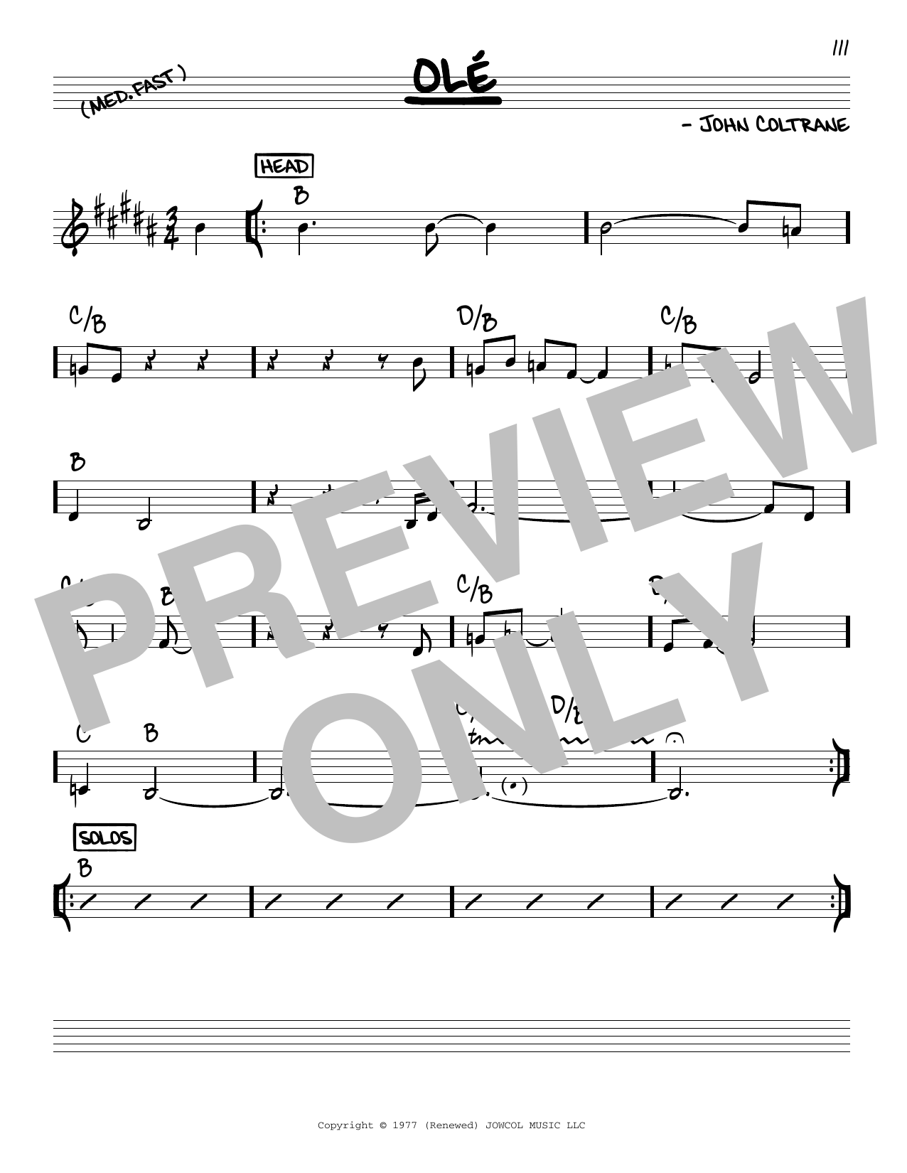 Download or print John Coltrane Olé sheet music, chords and digital score arranged for Real Book – Melody & Chords. This Jazz score includes 1 page(s).