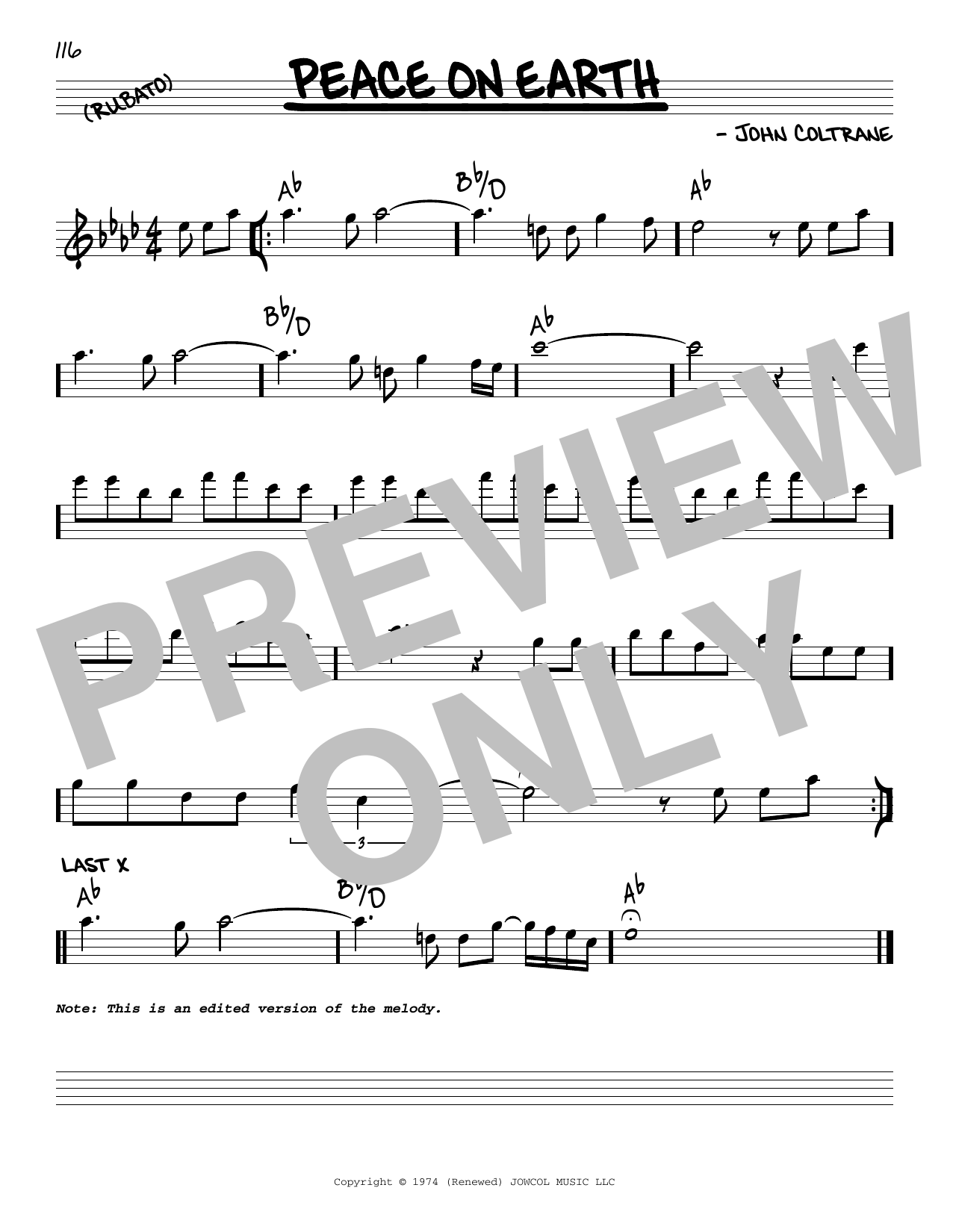Download or print John Coltrane Peace On Earth sheet music, chords and digital score arranged for Real Book – Melody & Chords. This Jazz score includes 1 page(s).