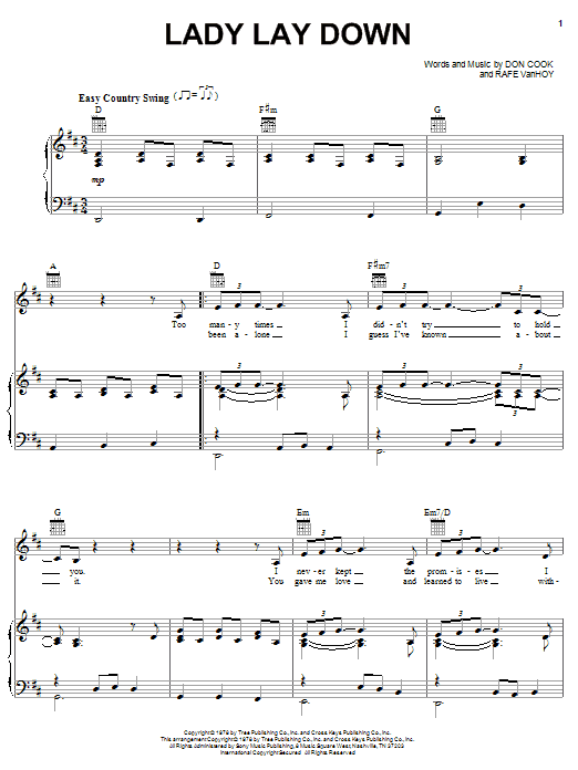 Download or print John Conlee Lady Lay Down sheet music, chords and digital score arranged for Piano, Vocal & Guitar Chords (Right-Hand Melody). This Country score includes 3 page(s).