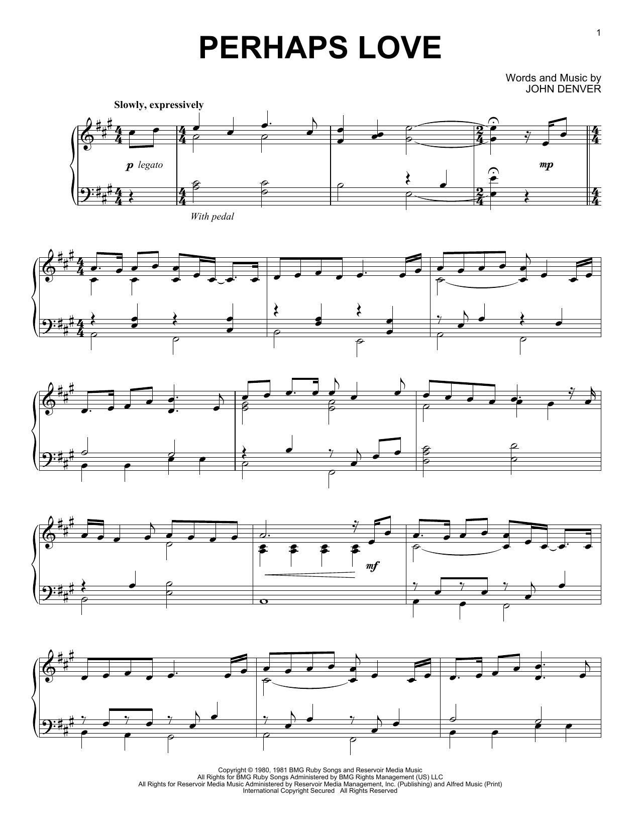 Download or print John Denver and Placido Domingo Perhaps Love sheet music, chords and digital score arranged for Piano Solo. This Pop score includes 3 page(s).