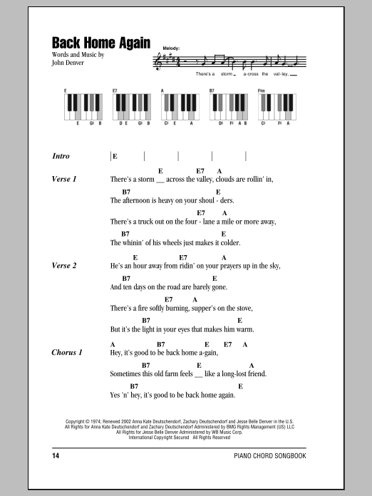 Download or print John Denver Back Home Again sheet music, chords and digital score arranged for Guitar Tab (Single Guitar). This Country score includes 6 page(s).