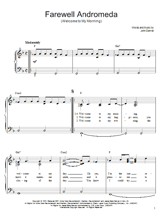 Download or print John Denver Farewell Andromeda (Welcome To My Morning) sheet music, chords and digital score arranged for Easy Piano. This Pop score includes 4 page(s).