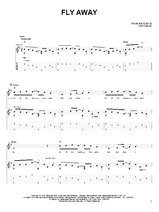 Download or print John Denver Fly Away sheet music, chords and digital score arranged for Guitar Tab. This Country score includes 4 page(s).