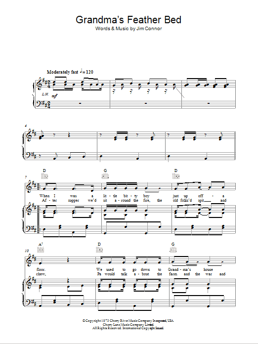 Download or print John Denver Grandma's Feather Bed sheet music, chords and digital score arranged for Piano, Vocal & Guitar Chords. This Country score includes 5 page(s).