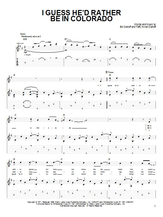 Download or print John Denver I Guess He'd Rather Be In Colorado sheet music, chords and digital score arranged for Guitar Tab. This Folk score includes 3 page(s).