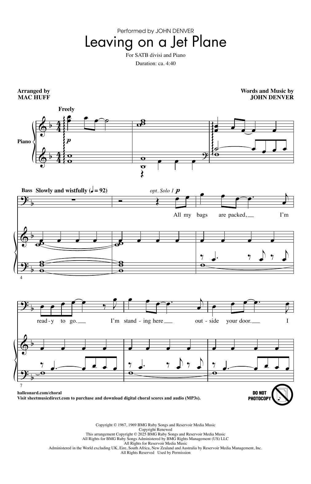 Download or print John Denver Leaving On A Jet Plane (arr. Mac Huff) sheet music, chords and digital score arranged for SATB divisi Choir. This Folk score includes 19 page(s).
