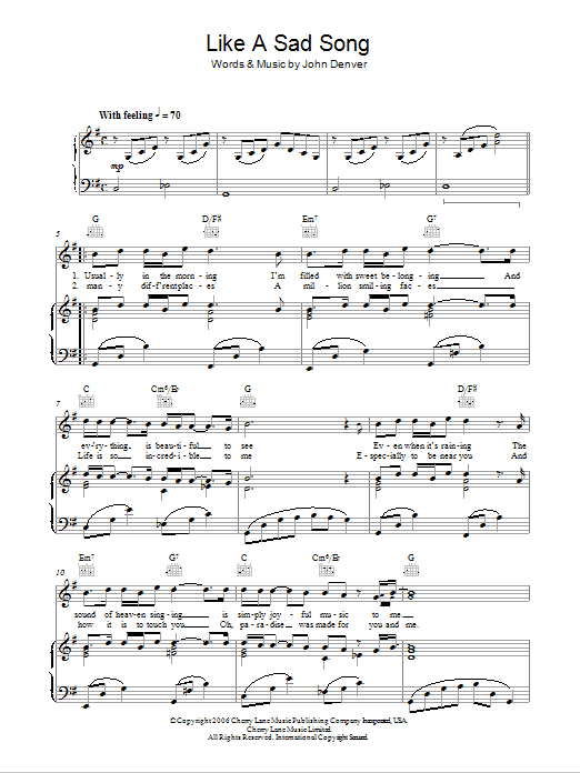 Download or print John Denver Like A Sad Song sheet music, chords and digital score arranged for Piano, Vocal & Guitar Chords. This Country score includes 5 page(s).