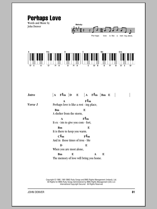 Download or print John Denver Perhaps Love sheet music, chords and digital score arranged for Piano, Vocal & Guitar Chords (Right-Hand Melody). This Country score includes 4 page(s).