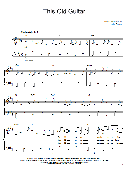 Download or print John Denver This Old Guitar sheet music, chords and digital score arranged for Piano, Vocal & Guitar Chords. This Country score includes 4 page(s).