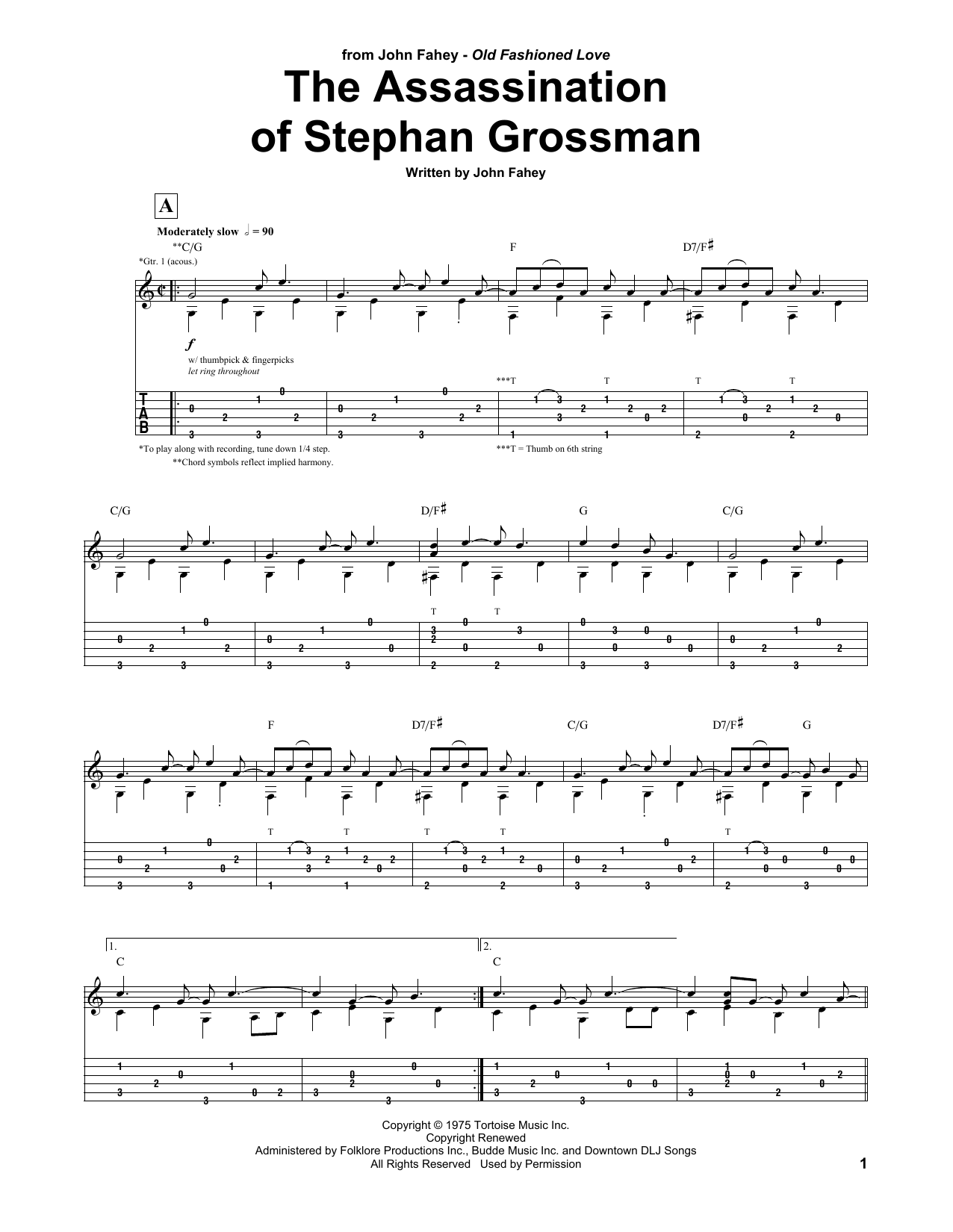 Download or print John Fahey Assassination Of Stephan Grossman sheet music, chords and digital score arranged for Guitar Tab. This Folk score includes 4 page(s).