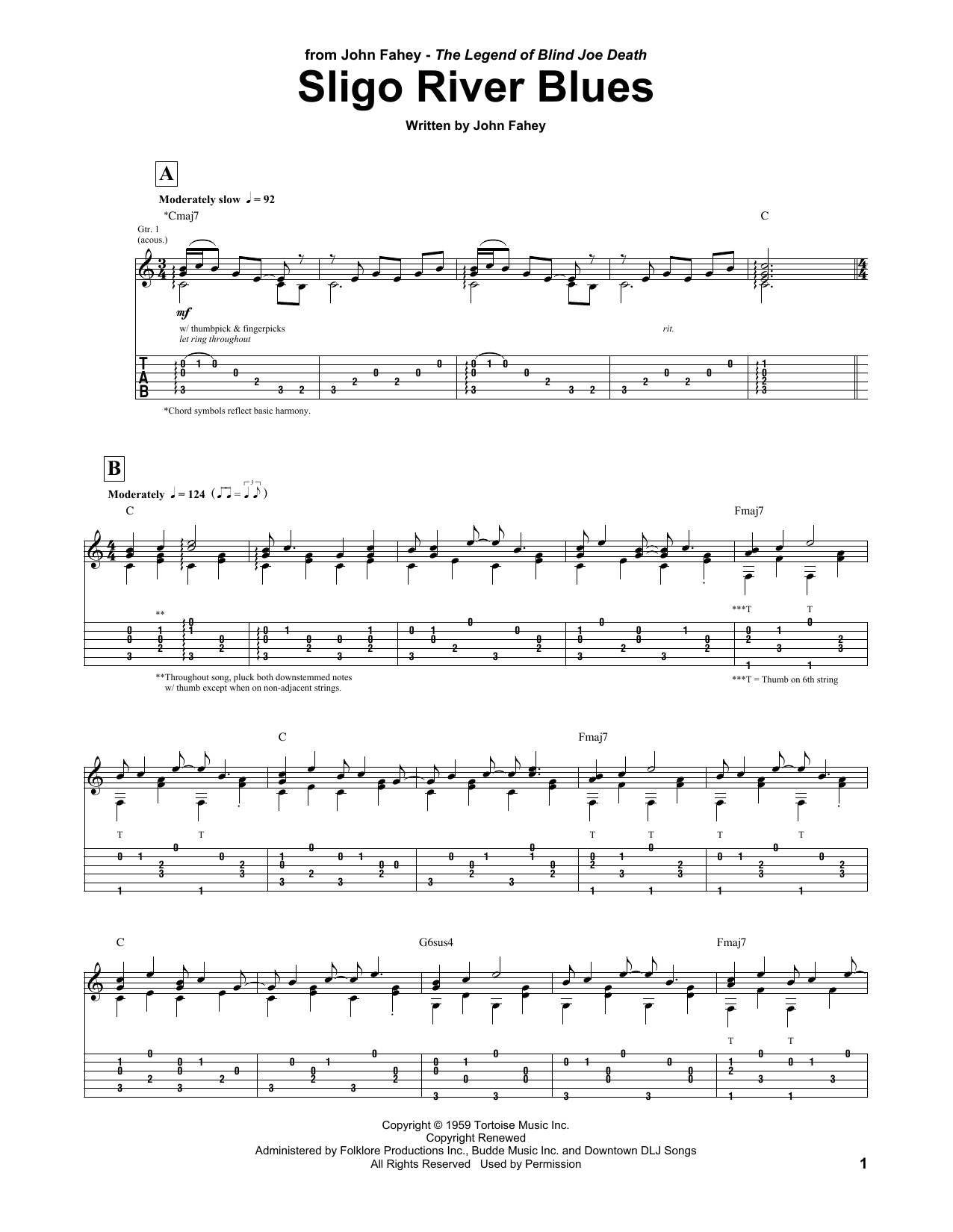 Download or print John Fahey Sligo River Blues sheet music, chords and digital score arranged for Guitar Tab. This Folk score includes 4 page(s).