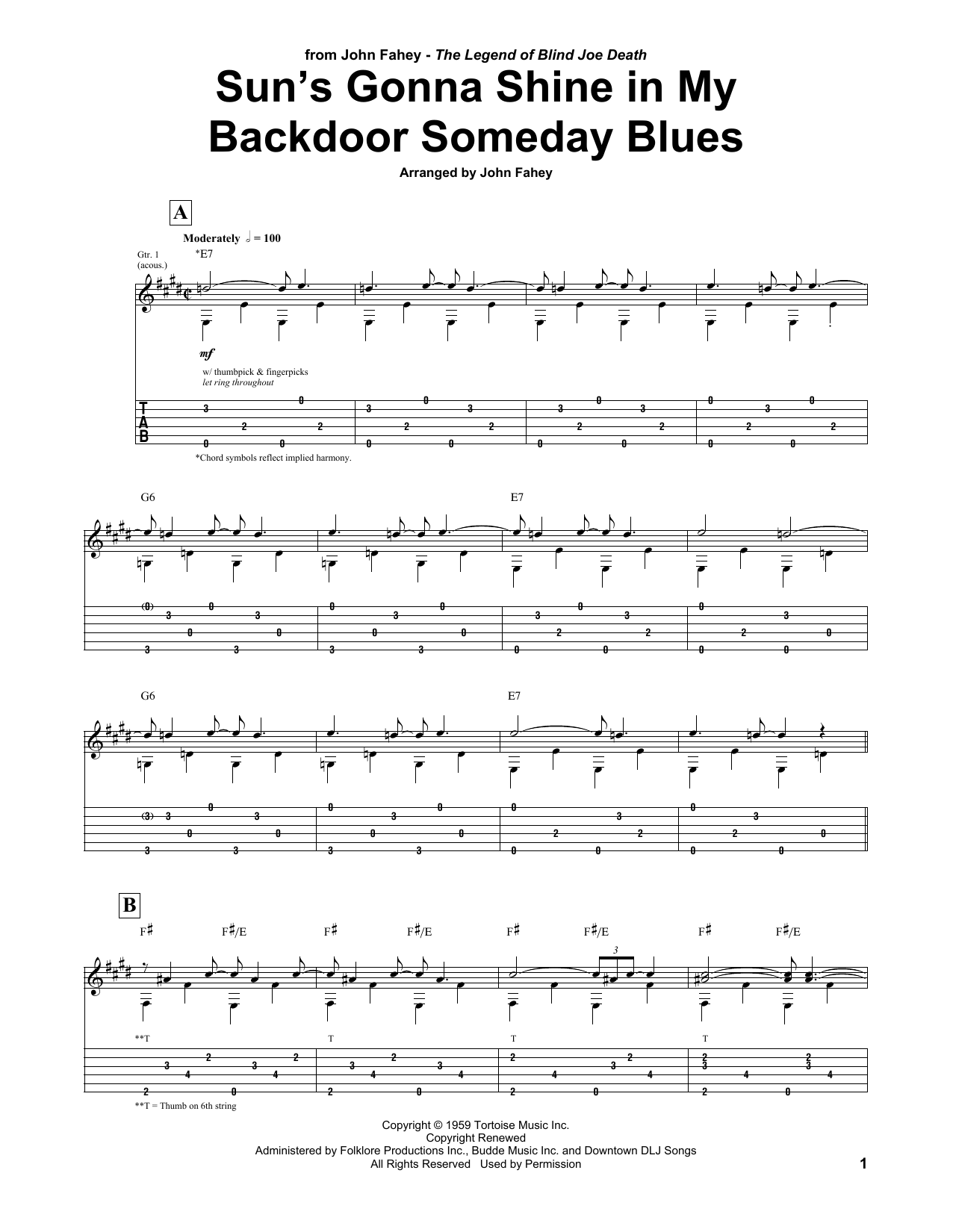 Download or print John Fahey Sun's Gonna Shine In My Backdoor Someday Blues sheet music, chords and digital score arranged for Guitar Tab. This Folk score includes 10 page(s).