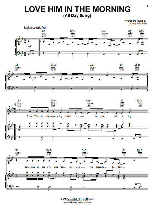Download or print John Fischer Love Him In The Morning (All Day Song) sheet music, chords and digital score arranged for Piano, Vocal & Guitar Chords (Right-Hand Melody). This Christian score includes 5 page(s).