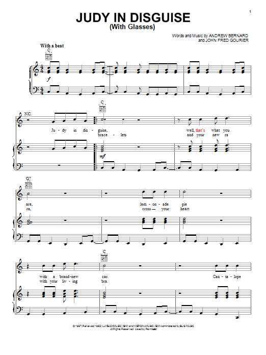 Download or print John Fred & His Playboy Band Judy In Disguise (With Glasses) sheet music, chords and digital score arranged for Piano, Vocal & Guitar Chords (Right-Hand Melody). This Pop score includes 4 page(s).