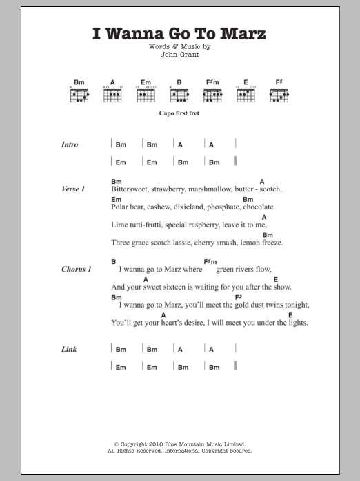 Download or print John Grant I Wanna Go To Marz sheet music, chords and digital score arranged for Guitar Chords/Lyrics. This Pop score includes 2 page(s).