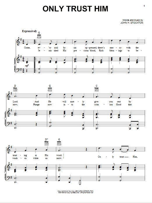 Download or print John H. Stockton Only Trust Him sheet music, chords and digital score arranged for Piano, Vocal & Guitar Chords (Right-Hand Melody). This Christian score includes 2 page(s).