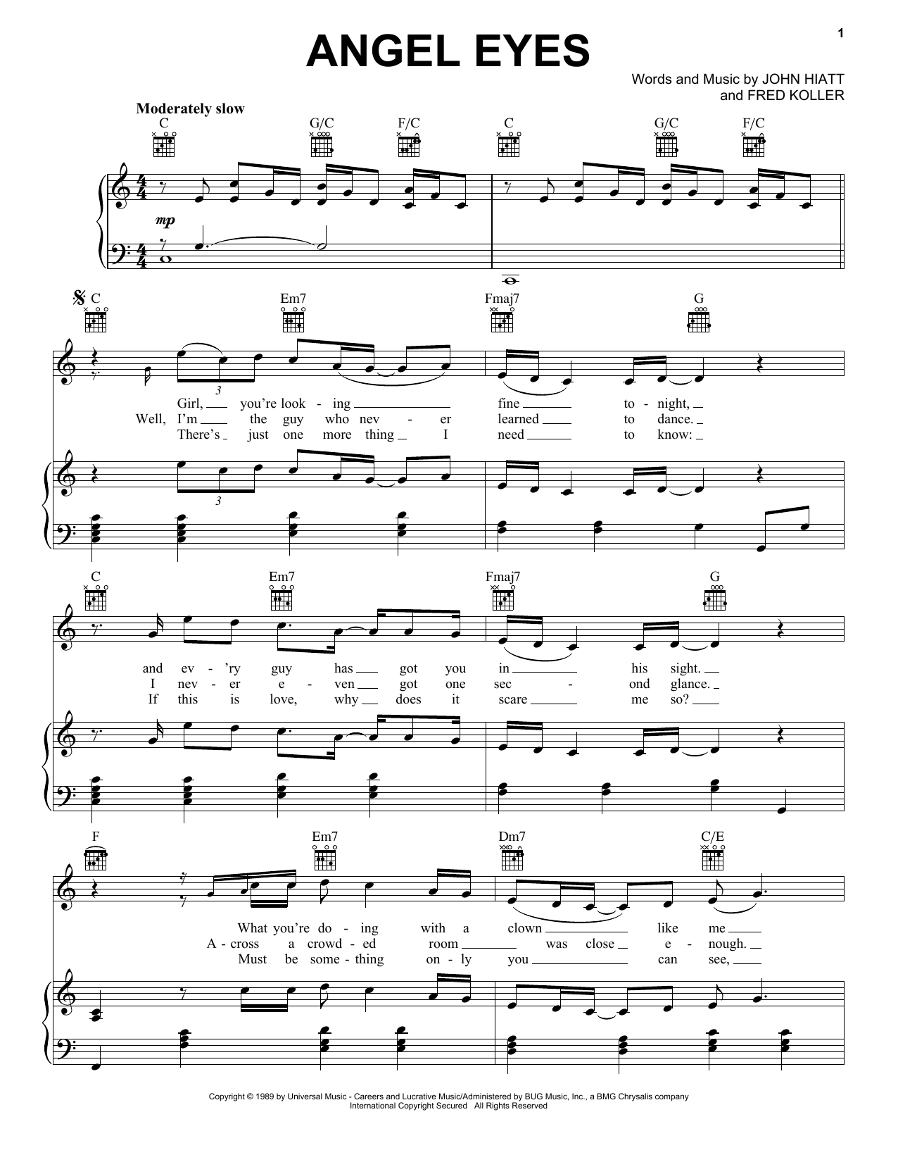 Download or print John Hiatt Angel Eyes sheet music, chords and digital score arranged for Easy Piano. This Pop score includes 4 page(s).