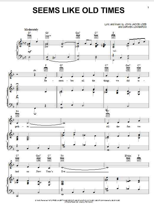 Download or print John Jacob Loeb Seems Like Old Times sheet music, chords and digital score arranged for Piano, Vocal & Guitar Chords (Right-Hand Melody). This Film/TV score includes 4 page(s).