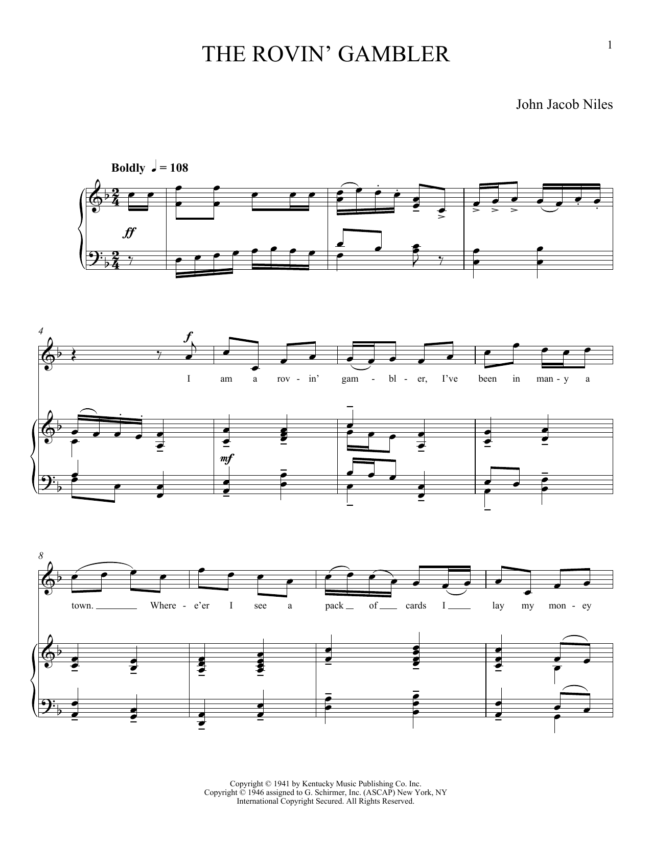 Download or print John Jacob Niles The Rovin' Gambler sheet music, chords and digital score arranged for Piano & Vocal. This Classical score includes 6 page(s).