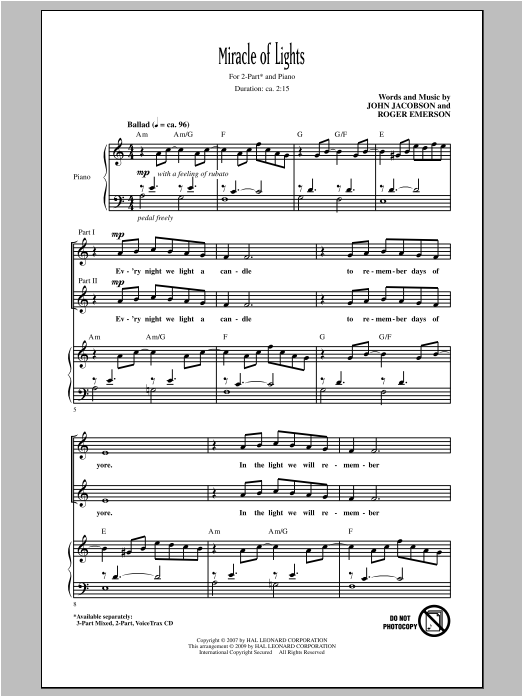 Download or print Roger Emerson Miracle Of Lights sheet music, chords and digital score arranged for 2-Part Choir. This Christmas score includes 7 page(s).