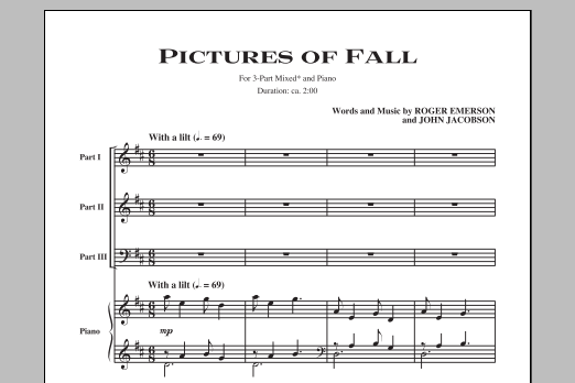 Download or print John Jacobson Pictures Of Fall sheet music, chords and digital score arranged for 3-Part Mixed Choir. This Concert score includes 1 page(s).