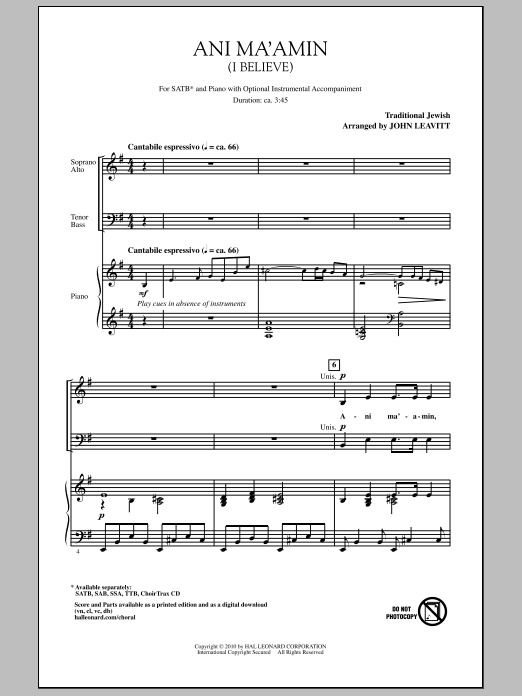 Download or print John Leavitt Ani Ma'amin (I Believe) sheet music, chords and digital score arranged for SSA Choir. This Concert score includes 8 page(s).