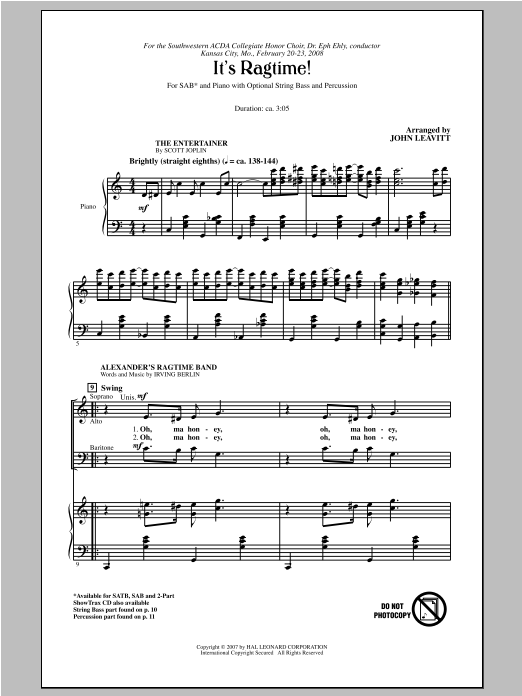 Download or print John Leavitt It's Ragtime! sheet music, chords and digital score arranged for SAB Choir. This Jazz score includes 11 page(s).
