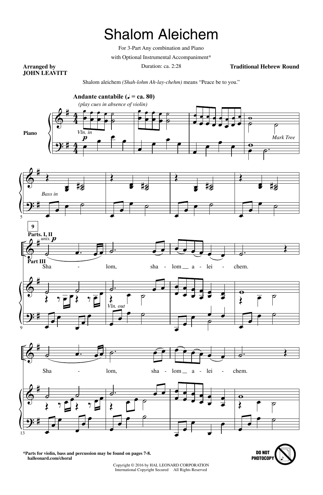Download or print John Leavitt Shalom Aleichem sheet music, chords and digital score arranged for 3-Part Mixed Choir. This Pop score includes 7 page(s).