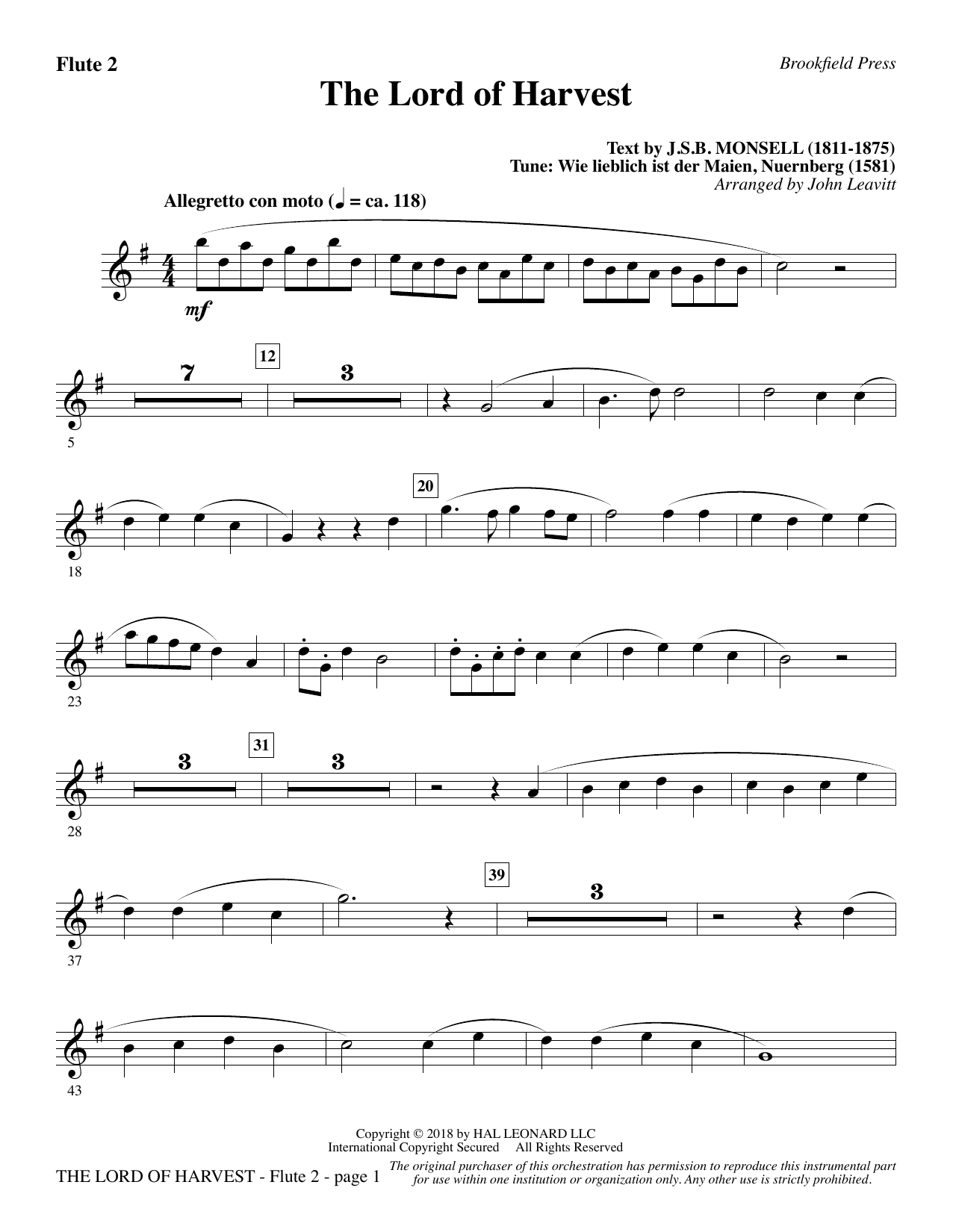 Download or print John Leavitt The Lord of Harvest - Flute 2 sheet music, chords and digital score arranged for Choir Instrumental Pak. This Sacred score includes 2 page(s).